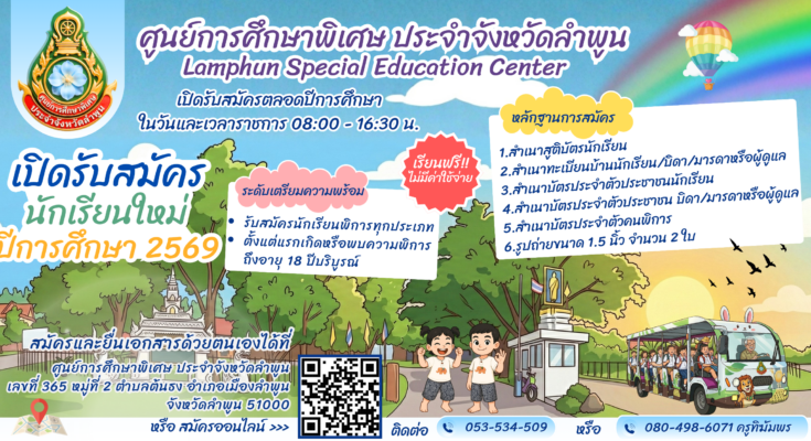 ศูนย์การศึกษาพิเศษ ประจำจังหวัดลำพูนเลขที่ 365 หมู่ที่ 2 ตำบลต้นธง อำเภอเมืองลำพูน จังหวัดลำพูน 51000 หรือ สมัครออนไลน์ >>> https://q.me-qr.com/1l4210p5