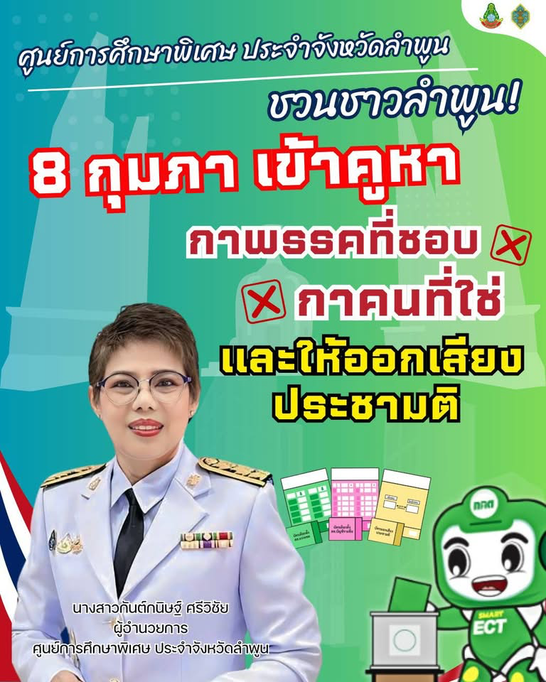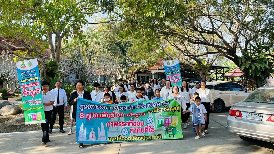 วันศุกร์ที่ 6 กุมภาพันธ์ 2569 นางสาวกันต์กนิษฐ์ ศรีวิชัย ผู้อำนวยการศูนย์การศึกษาพิเศษประจำจังหวัดลำพูน มอบหมายให้นายนพพร แก้วโยธา รองผู้อำนวยการ เป็นประธานในพิธีเปิดกิจกรรม เดินรณรงค์การไปใช้สิทธิ์เลือกตั้งและลงประชามติ พร้อมด้วยคณะครู นักเรียน และผู้ปกครอง เพื่อกระตุ้นให้ประชาชนเกิดจิตสำนึกในการมีส่วนร่วมทางการเมือง และออกมาใช้สิทธิเลือกตั้งสมาชิกสภาผู้แทนราษฎร รวมถึงการออกเสียงประชามติ ในวันที่ 8 กุมภาพันธ์ 2569